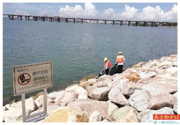 近日,保洁公司工作人员在对礁石和岸边垃圾进行清理。 南都记者 吴春熠 摄