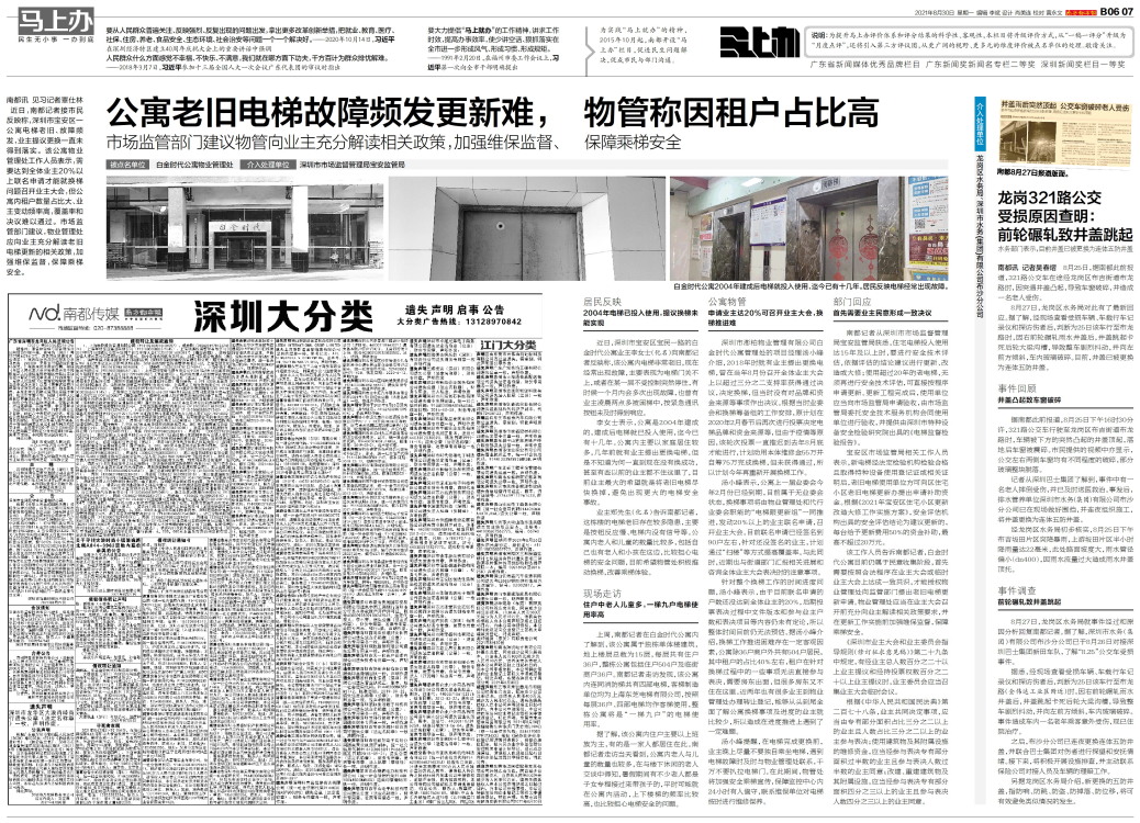 被点名单位 白金时代公寓物业管理处 介入处理单位 深圳市市场监督管理局宝安监管局 南都讯 见习记者覃仕林 近日,南都记者接市民反映称,深圳市宝安区一公寓电梯老旧、故障频发,业主提议更换一直