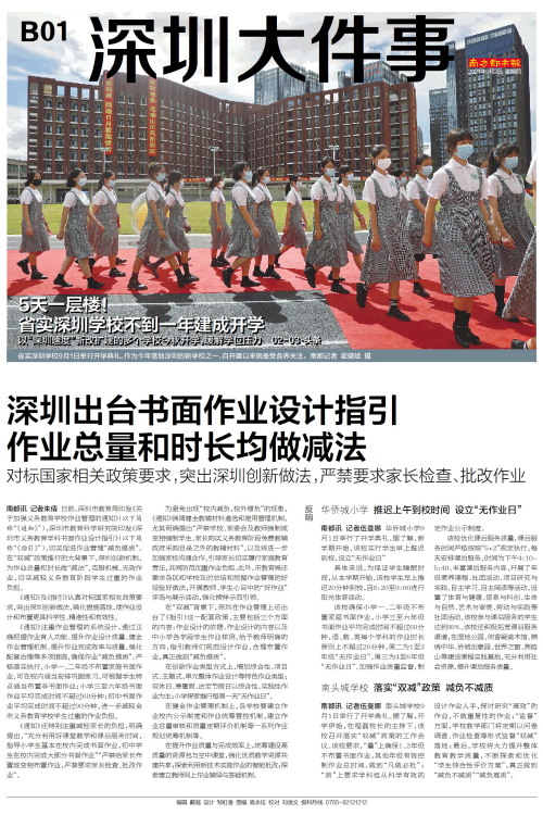 南都讯 记者朱倩 日前,深圳市教育局印发《关于加强义务教育学校作业管理的通知》(以下简称“《通知》”),深圳市教育科学研究院印发《深圳市义务教育学科书面作业设计指引》(以下简称“《指引》”),切实