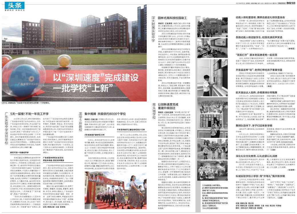广东实验中学深圳学校 5天一层楼!不到一年完工开学 2020年12月24日,深圳市教育局与广东实验中学签订合作办学协议,创办广东实验中学深圳学校,并正式落户龙岗。学校以5天一层楼的“深圳速度”