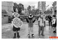 “疯狂动物城”主角们迎接学生开学了!9月1日,在深圳市罗湖区螺岭外国语实验学校,“朱迪”、“尼克”、“闪电”一大早等候学生们,“我为螺岭袋盐”的牌子格外显眼;还有学生代表也早早拿着有关返校、防疫的