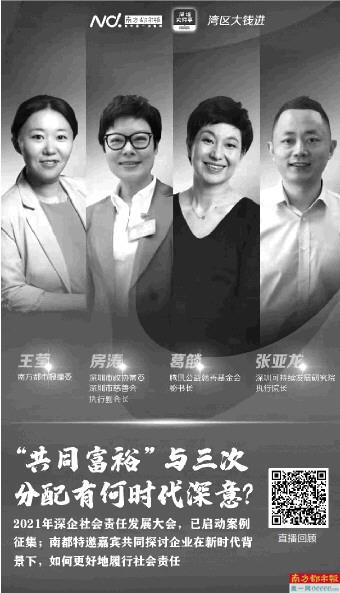 在大会举办前夕,9月2日,南都《湾区大钱进》邀请2021深企社会责任评审调研委员会成员:深圳市慈善会执行副会长、深圳市政协常委房涛和深圳可持续发展研究院执行院长张亚龙,特邀腾讯公益慈善基金会秘书长葛燄,共同做客栏目,解读“共同富裕”与三次分配的时代深意,探讨企业在新时代背景下如何更好地履行社会责任,以及公益慈善事业如何发挥好三次分配的功能作用?