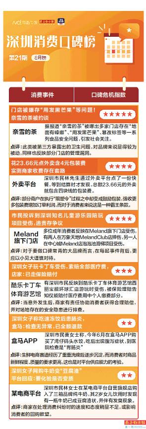 8月初,奈雪的茶被曝光卫生安全问题引发社会舆论和监管部门关注,事后虽作出及时应对,但对品牌口碑产生较大的负面影响;从月内的食品消费纠纷问题中可见,部分品牌处理消费纠纷问题方式逐步成熟,及时处理售后问题亦反映了对品牌口碑的重视。近年来,室内儿童乐园、卡丁车等游玩项目成为新消费热门项目,而南都深圳大件事接到多位消费者反映在场地中发生安全事故问题,暴露出目前此类安全隐患亟待引起品牌重视。