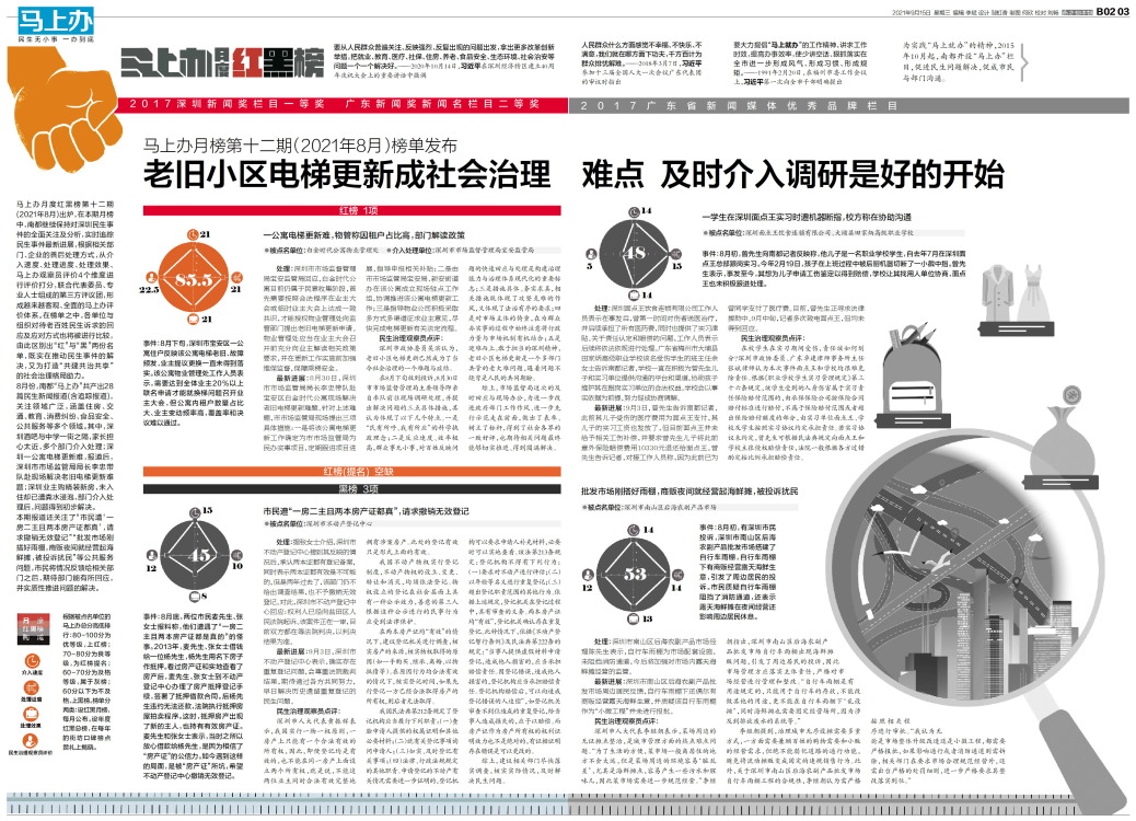 马上办月度红黑榜第十二期(2021年8月)出炉,在本期月榜中,南都继续保持对深圳民生事件的全面关注及分析,实时追踪民生事件最新进展,根据相关部门、企业的善后处理方式,从介入速度、处理进度、处理效果