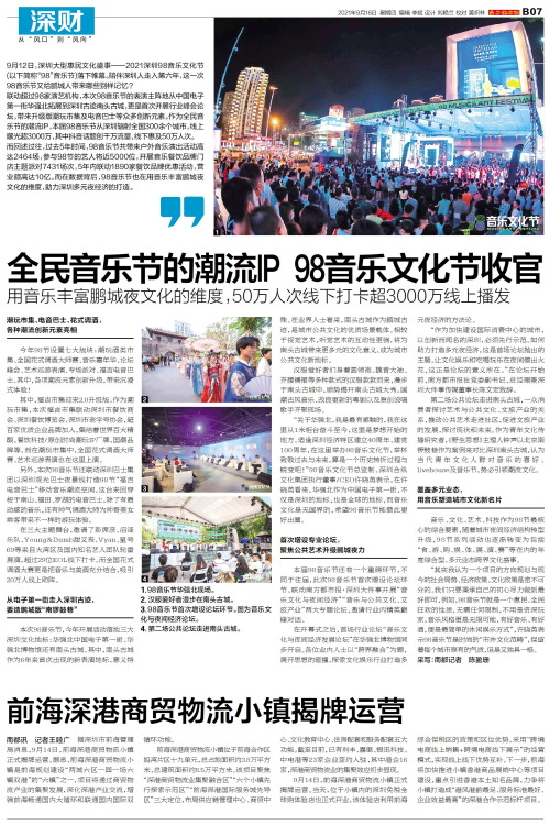 9月12日,深圳大型惠民文化盛事——2021深圳98音乐文化节(以下简称“98”音乐节)落下帷幕。陪伴深圳人走入第六年,这一次98音乐节又给鹏城人带来哪些别样记忆? 联动超过98家演艺机构,本次