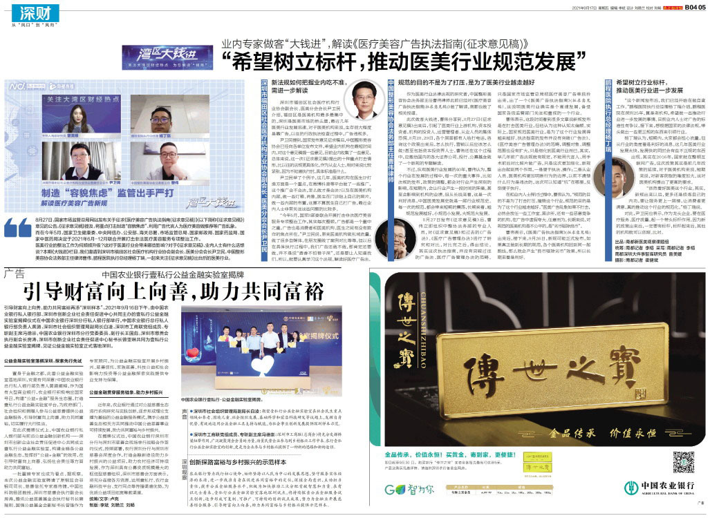 专题 引导财富向上向善,助力共同富裕再添“深圳样本”。2021年9月16日下午,由中国农业银行私人银行部、深圳市创新企业社会责任促进中心共同主办的壹私行公益金融实验室揭牌仪式在中国农业银行深圳分