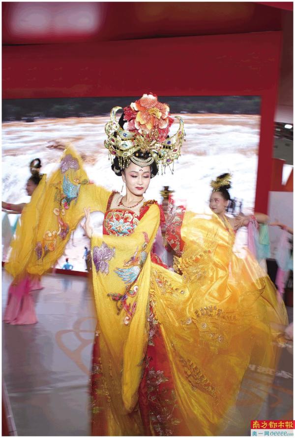 9月23日下午,在文博会陕西省展台,身着盛装的舞蹈演员翩翩起舞。 南都记者 胡可 摄