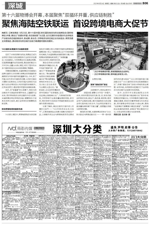 南都讯 记者张艳丽 9月23日,第十六届中国(深圳)国际物流与供应链博览会(简称物博会)开幕,展会以“双循环并重,供应链制胜”为主题,全方位展示后疫情时代全球物流产业链与供应链的新技术、新成果、新