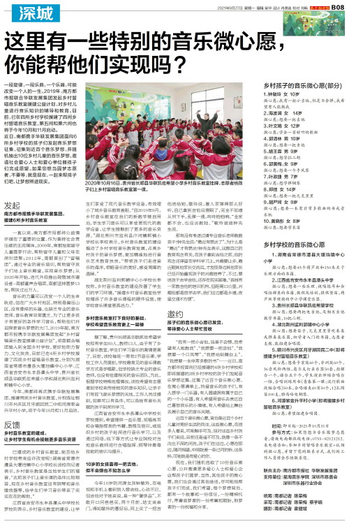 一段旋律,一段乐曲,一个乐器,可能改变一个人的一生。2019年,南方都市报联合华联发展集团发起乡村留唱音乐教室援建公益计划,对乡村儿童进行音乐知识的辅导和教育。目前,已在四所乡村学校援建了四间乡村