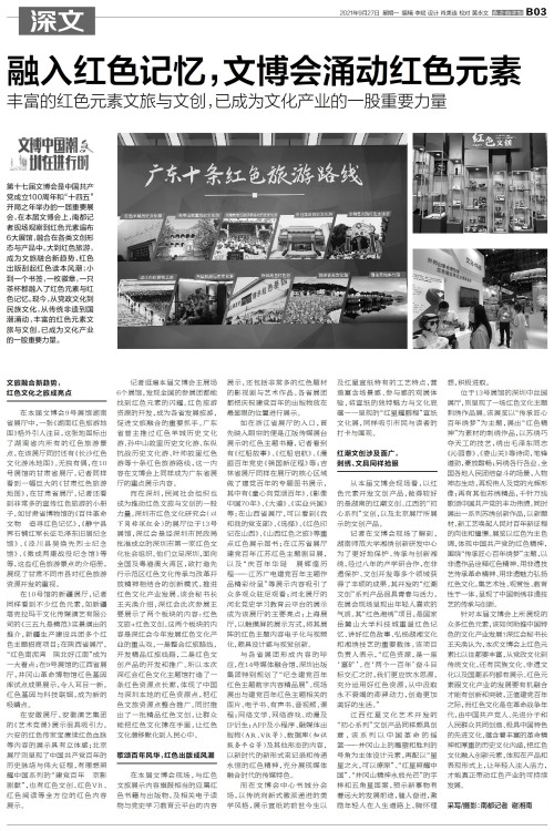 第十七届文博会是中国共产党成立100周年和“十四五”开局之年举办的一届重要展会,在本届文博会上,南都记者现场观察到红色元素遍布6大展馆,融合在各类文创形态与产品中。大到红色旅游,