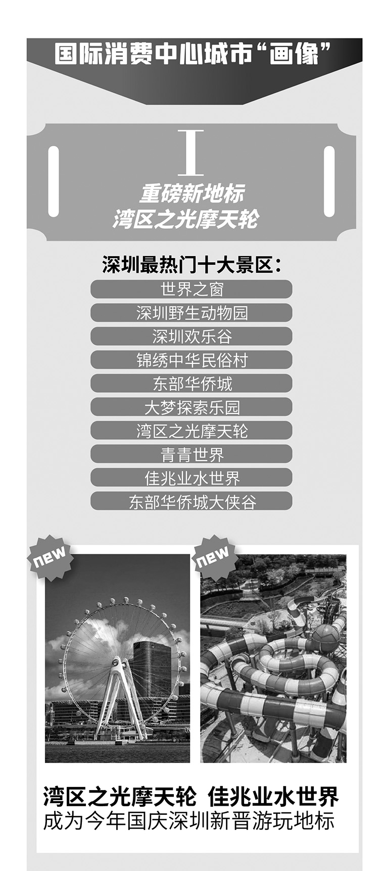 而深圳最热门的十大景区分别为世界之窗、深圳野生动物园、深圳欢乐谷、锦绣中华民俗村、东部华侨城、大梦探索乐园、湾区之光摩天轮、青青世界、佳兆业水世界、东部华侨城大侠谷。当中,湾区之光摩天轮与佳兆业水世界成为新晋游玩地标。