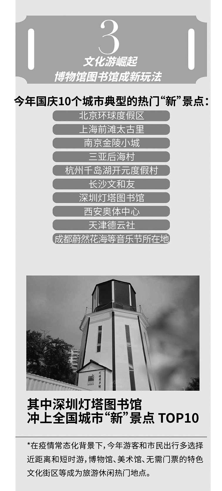 在疫情常态化背景下,今年游客和市民出行多选择近距离和短时游,博物馆、美术馆、无需门票的特色文化街区、市政公园等成为旅游休闲热门地点。比如以盐田区沙头角灯塔图书馆为代表的公益文化地,也成为大众个性出游的地标之一。