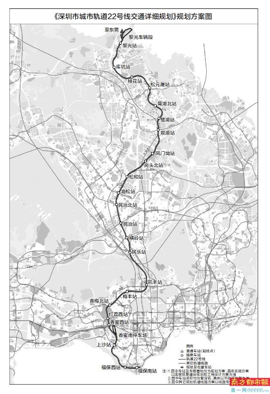南都讯 记者张艳丽 10月11日,深圳市规划和自然资源局发布地铁22号线详细规划。根据规划方案,22号线设计最高运行速度为100公里/小时,采用A型车8辆编组,主要承担福田主中心对龙华和东莞等地区的辐射带动作用、促进多中心组团式空间结构的形成和缓解中部走廊交通压力的功能,实现福田主中心与观澜组团中心45分钟、临深片区60分钟通达的规划目标。