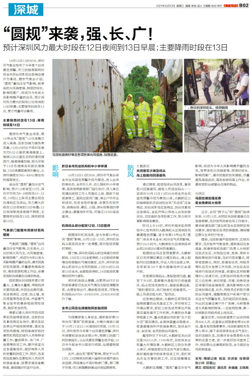 10月12日11时30分,深圳市气象台发布了今年首个台风黄色预警,市三防指挥部同时将全市防台风Ⅳ级应急响应提升为Ⅲ级。据市气象台介绍,“圆规”叠加冷空气影响,其带来的大风强度强、持续时间长、影响范
