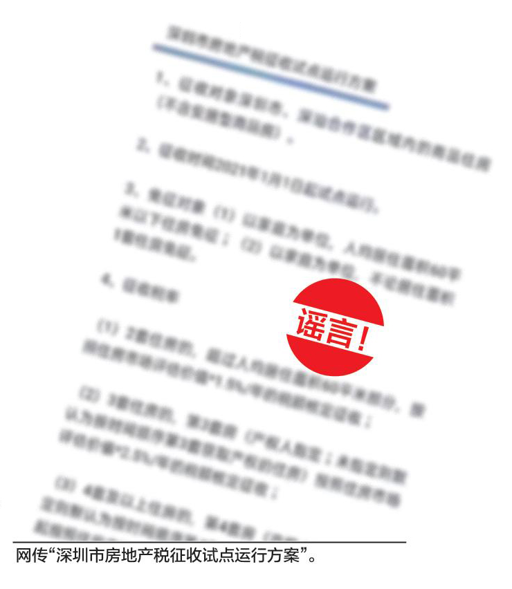 南都讯 记者黄璐 针对网传“深圳市房地产税征收试点运行方案”,深圳市住建局相关人士回应称,此征收试点方案为不实消息。该消息最明显错误为:征收时间为2021年1月1日。
