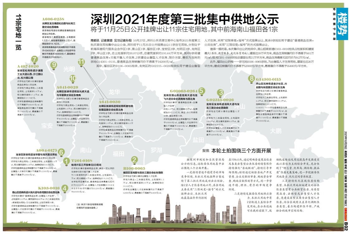 南都讯 记者黄璐 见习记者孙阳 10月27日,深圳公共资源交易中心发布2021年度第三批次居住用地集中出让公告。深圳将于11月25日公开挂牌出让11宗住宅用地,分别位于前海深港现代服务业合作区1宗