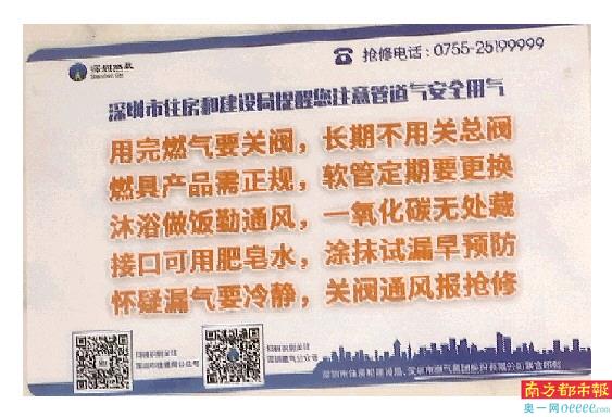 居民家中如何进行管道天然气的安全自查?“自己检查的话,用洗洁精兑水,涂在接口处,如果接口处连续冒泡,就表示漏气了。这时应该先关闭总开关,到室外安全的地方拨打深圳燃气抢修热线0755-25199999”吴伟强现场检查时也向居民介绍了燃气安全自查办法。