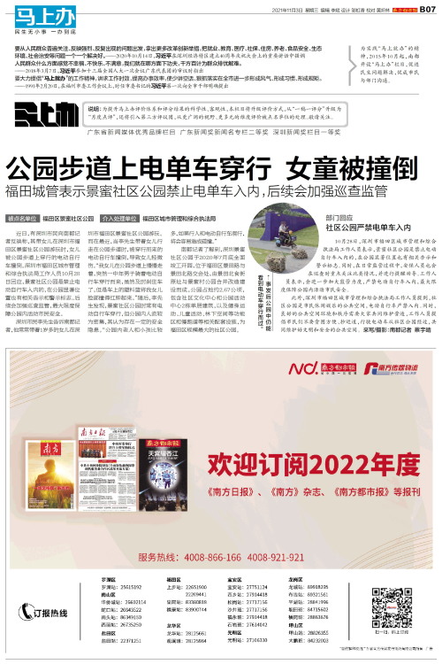 被点名单位 福田区景蜜社区公园 介入处理单位 福田区城市管理和综合执法局 近日,有深圳市民向南都记者反映称,其带女儿在深圳市福田区景蜜社区公园游玩时,女儿被公园步道上穿行的电动自行