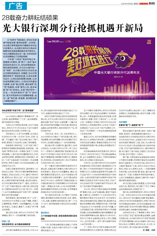 从“拓荒牛”到前海石,深圳正在源源不断诞生着“春天的故事”。28年前,光大银行将希望的种子播撒在深圳这片改革热土,光大银行深圳分行由此伴随着特区快速发展的脚步而不断壮大,与光大集团驻深企业一道,为