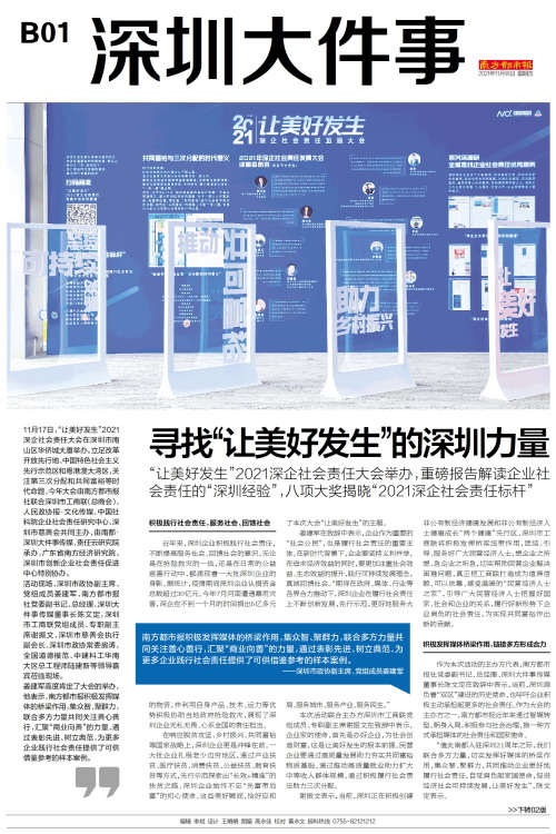 11月17日,“让美好发生”2021深企社会责任大会在深圳市南山区华侨城大厦举办。立足改革开放先行地、中国特色社会主义先行示范区和粤港澳大湾区,关注第三次分配和共同富裕等时代命题,今年大会由南方都