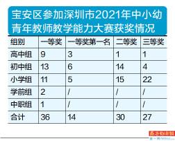 近期,2021年深圳市中小学青年教师教学能力大赛圆满收官,宝安区在赛事中大放异彩,亮出了一份飘红的成绩单。据不完全统计,大赛中宝安区获得一等奖36人次、二等奖30人次、三等奖27人次。值得一提的是,由于市赛成绩优异,宝安区被推荐参加第三届广东省中小学青年教师教学能力大赛人数在全市排第一,占比达30.4%。