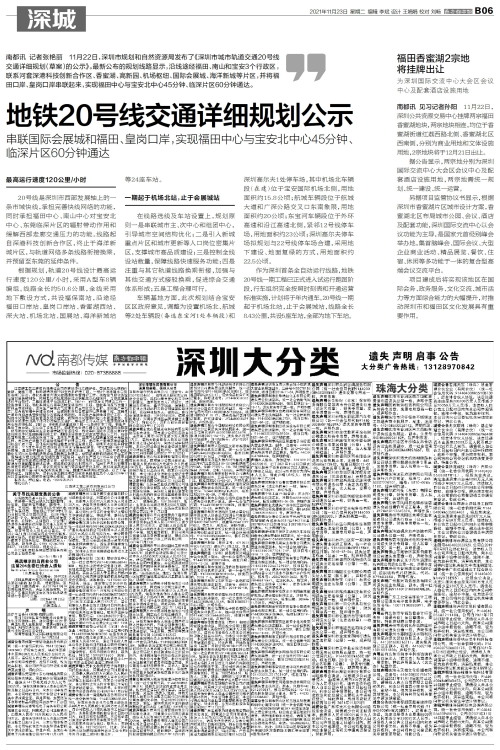 南都讯 记者张艳丽 11月22日,深圳市规划和自然资源局发布了《深圳市城市轨道交通20号线交通详细规划(草案)的公示》。最新公布的规划线路显示,沿线途经福田、南山和宝安3个行政区,联系河套深港