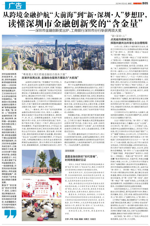 深圳金融创新再添亮丽样本。日前,深圳市金融创新领域最高规格奖项——2020年深圳市金融创新奖评选结果出炉,工行深圳市分行从众多金融机构中脱颖而出,“粤港澳大湾区跨境金融综合服务方案”获得金融贡献奖