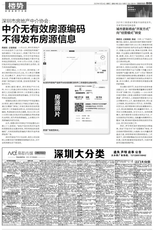 南都讯 记者顾威 11月22日,深圳市房地产中介协会发布了《关于进一步规范发布房源广告的通知》(下称《通知》),明确了房产中介须获取有效房源信息编码,方可对外发布相应房源信息,无有效房源信息编码不