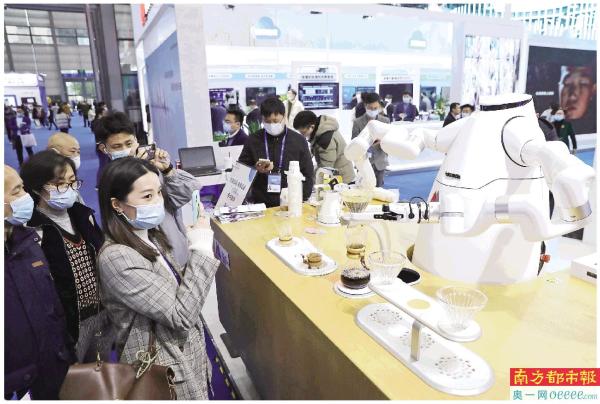 高交会的深圳会展中心会场,“大白”机器人正制作手冲咖啡。 南都记者 赵炎雄 摄