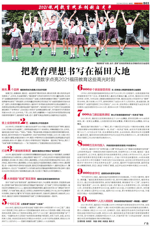 擦亮1个品牌 福田教育成为首善之区金字招牌 首善之区,首善教育。福田区一直坚持把“最好的地块、最优的资源、最大笔的资金用在教育上”,近年来,在全国范围内,“福田教育”已然成为具有先行示范力量的品