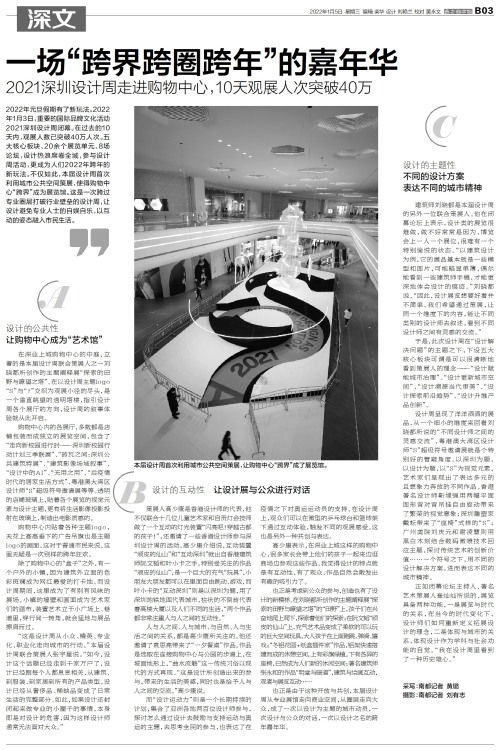 2022年元旦假期有了新玩法。2022年1月3日,重要的国际品牌文化活动2021深圳设计周闭幕。在过去的10天内,观展人数已突破40万人次。五大核心板块、20余个展览单元、8场论坛,设计热浪席卷全