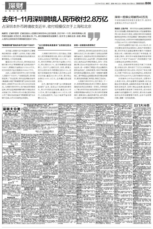 南都讯 记者叶霖芳 记者日前从人民银行深圳市中心支行获悉,2021年1-11月,深圳市跨境人民币收付金额2.8万亿元,同比增长26.7%,收付规模保持全国第三,仅次于上海和北京,目前,跨境人民币占