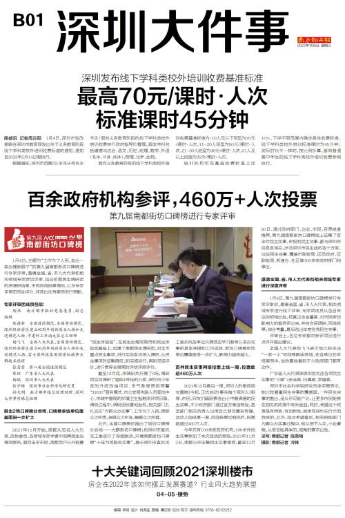 1月4日,主题为“工作为了人民,走出一条治理新路子”的第九届南都街坊口碑榜进行专家评审,邀请全国、省、市人大代表和相关领域专家参加评审。结合前期民生调研团的深调研结果、市民网络投票情况,以及专家评