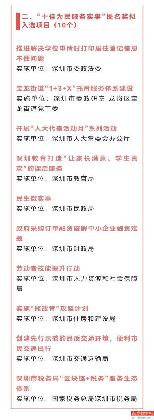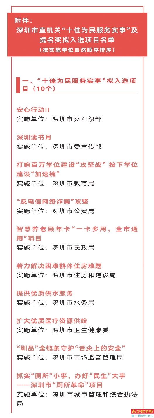 为充分发扬民主,广泛听取意见,接受社会监督,现对“十佳为民服务实事”及提名奖拟入选项目(见附件)予以公示。公示时间从2022年1月6日起,至1月10日止。如对名单有异议,请于公示期间通过电话、邮件等方式向市直机关工委或南方都市报社反映。