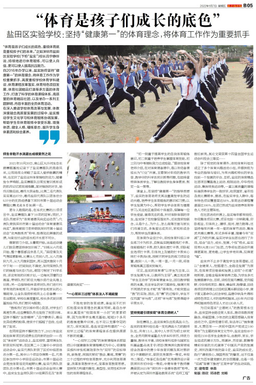 “体育是孩子们成长的底色,重视体育就是重视孩子们的未来。”正如深圳市盐田区实验学校(下称“盐实”)校长吕宁静所说,持续地进行体育锻炼,可以使人自信,更可以使人提高抗压能力。 自2016年办学以来