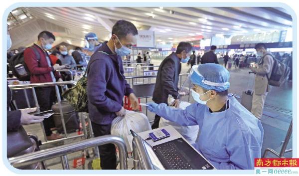 近日,广东省多地接连出现散发疫情。正逢春运,如何细化防疫措施、防止人员聚集,是今年春运面临的又一严峻考验。春运首日,记者在深圳北站东广场进站口看到,十余条进站通道同时开放,每个通道口前,先设置了一道查验健康信息的“关卡”,身穿防护服的工作人员手持防疫信息查询机,将旅客的身份证件放上去,系统就能快速显示健康码、核酸检测结果,无需再打开手机“亮码”,可实现快速进出站。