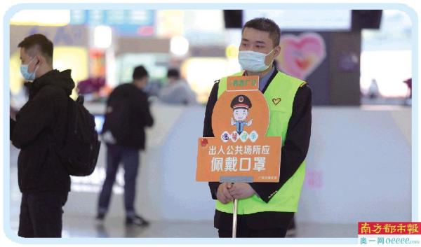深圳北站,志愿者在候车室内倡导大家全程戴口罩。