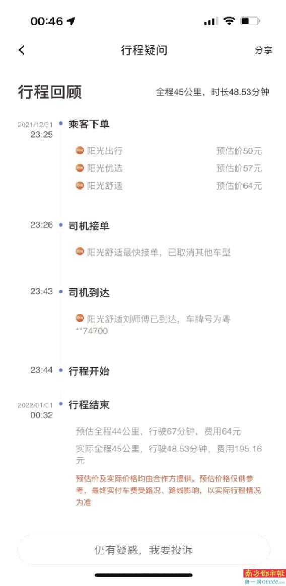 据其提供的行程回顾显示,平台“预估全程44公里,行驶67分钟,费用64元”,而“实际全程45公里,行驶48.53分钟,费用195.16元”,两者费用之间相差百余元。