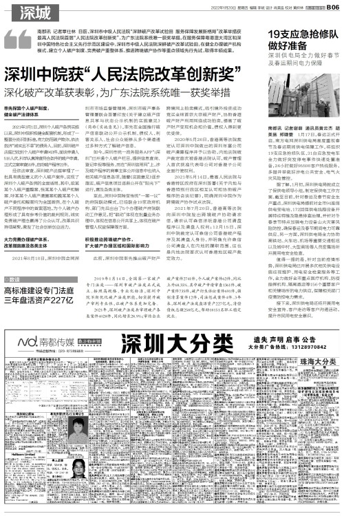 南都讯 记者覃仕林 日前,深圳市中级人民法院“深耕破产改革试验田 服务保障发展新格局”改革举措获最高人民法院首届“人民法院改革创新奖”,为广东法院系统唯一获奖举措。在服务保障粤港澳大湾区和深圳中国