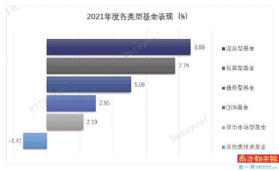 据通联数据Datayes!的统计,2021年整体公募基金(全市场除货币基金以外,下同)收益率相较2020年大幅回撤。具体而言,混合型基金2021年度平均收益为8.69%,而2020年这一数据为43.92%;股票型基金在2021年实现7.75%的平均收益,而前一年平均收益率达到40.96%。