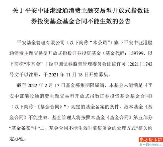 2月19日,平安基金公司公告平安中证港股通消费主题ETF(下称“平安中证港股通消费ETF”)发行失败。根据公告,该基金产品于2021年11月18日开始募集。截至今年2月17日基金募集期限届满。因该基金未能满足《平安中证港股通消费主题交易型开放式指数证券投资基金基金合同》(以下简称“《基金合同》”)规定的基金备案的条件,故该基金《基金合同》不能生效。基金管理人将按照《基金合同》相关约定处理募集资金。