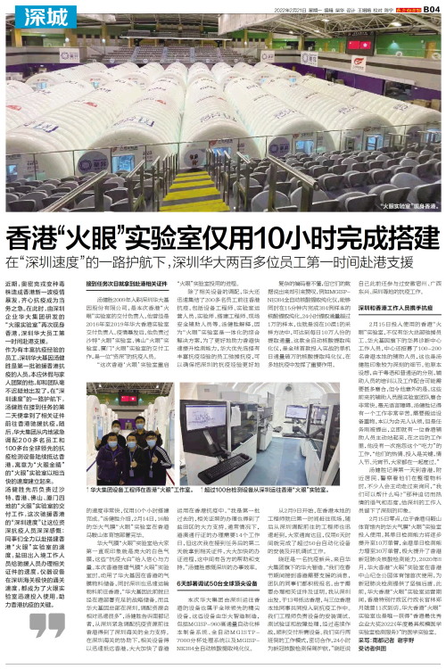 近期,奥密克戎变种毒株造成香港新一波疫情暴发,齐心抗疫成为当务之急。在此时,由深圳企业华大集团研发的“火眼实验室”再次现身香港,深圳华大员工第一时间赴港支援。 作为有丰富抗疫经验的员工,深圳华大