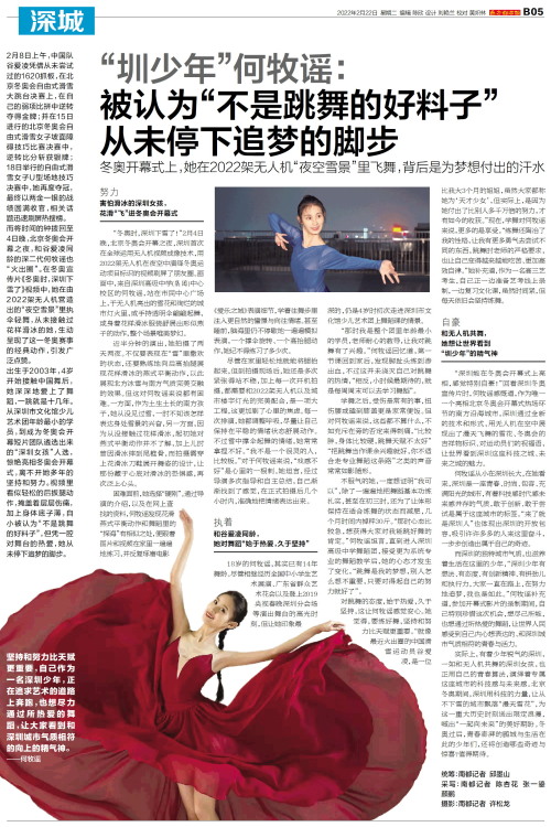 坚持和努力比天赋更重要,自己作为一名深圳少年,正在追求艺术的道路上奔跑,也想尽力通过所热爱的舞蹈,让大家看到和深圳城市气质相符的向上的精气神。——何牧谣 2月8日上午,中国队谷爱凌凭借从未尝试过