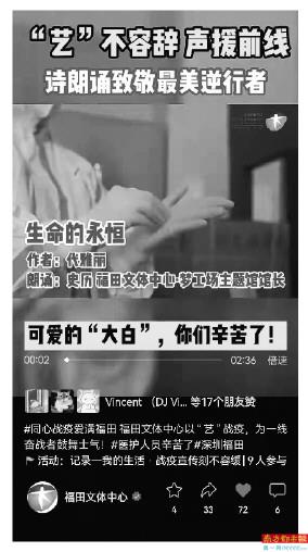 疫情发生以来,福田区公共文体中心号召文艺工作者围绕防疫抗疫主题开展文艺创作,一批批文艺作品陆续涌现,为抗击疫情注入文艺力量。