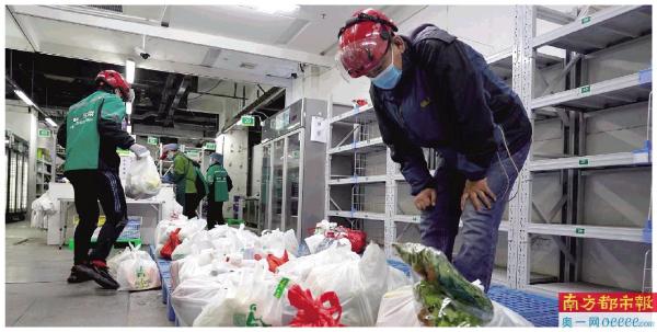 2月24日,某电商平台福田沙尾门店,工作人员正在根据订单情况分拣商品,外卖骑手有序开展送货服务。 南都记者 霍健斌 摄