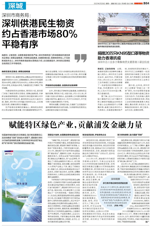 平稳有序南都讯 记者程昆 近期香港疫情形势严峻,深圳市商务部门多举措确保供港货源充足稳定、保障运输畅通、开辟新运输通道,支援香港抗疫,保障物资供应。27日的新闻发布会上,深圳市商务局副局长周明武介绍,近日
