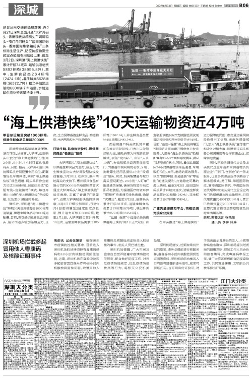 记者从市交通运输局获悉,自2月21日深圳全面开通“大铲湾码头-香港现代货箱码头”“妈湾码头-屯门内河码头”“盐田国际码头-香港国际集装箱码头”三条供港生活生产、防疫抗疫物资定时定点驳船专用航线以来