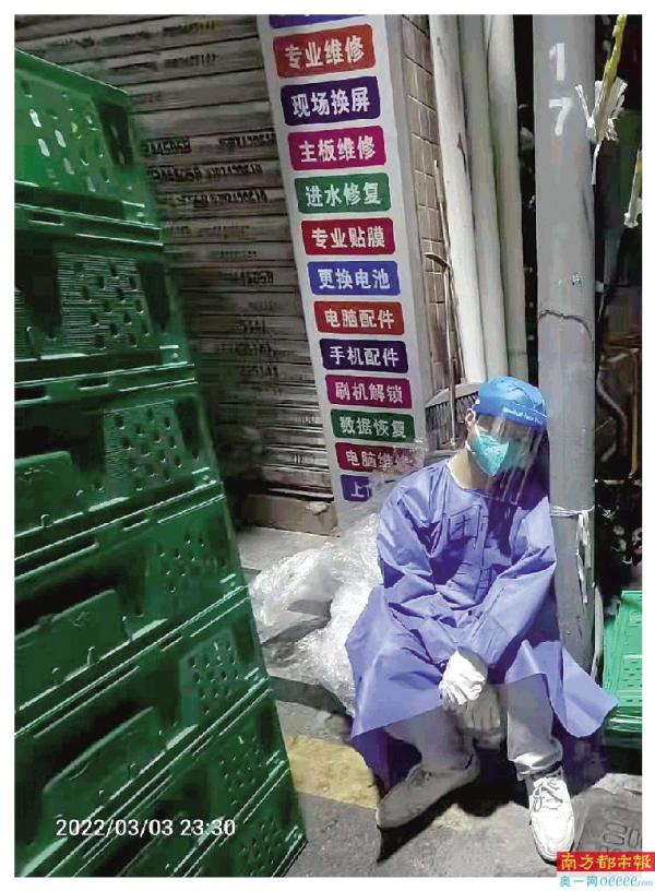 近日,深圳地铁义工联成员陈纪森在上沙社区开展志愿服务。陈纪森介绍称,他从3月1日开始,投身上沙社区抗疫工作,至今几乎每晚忙到凌晨3点后。疫情就是命令,他心中一直有种强大的信念让他克服困难,迎难而上。“晚上收工后,准备睡一觉后,但一个电话过来,让我又打起了精神,关键时期一刻也不敢疏忽。”