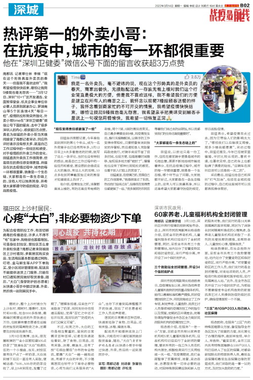 南都讯 记者覃仕林 李榕 “现在这个形势真是外卖员的春天……但是我不喜欢这样”,“我希望疫情快快结束,哪怕让我爬9楼我也毫无怨言……”3月12日,深圳“10+1”区齐发通告,全面暂停堂食,机关企事