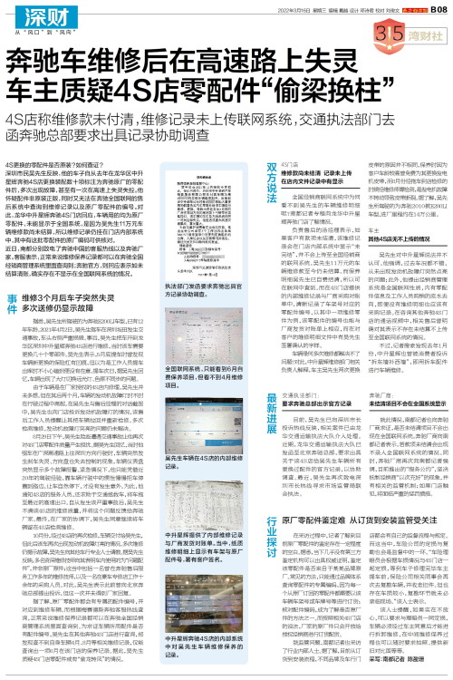 湾财社 4S更换的零配件是否原装?如何查证? 深圳市民吴先生反映,他的车子自从去年在龙华区中升星辉奔驰4S店更换装配数十项标注为奔驰原厂的零配件后,多次出现故障,甚至有一次在高速上失灵失控。他